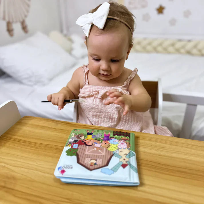 🌈 Kolorowanie wodą bez bałaganu – dziecko przesuwa paluszkiem po liniach, odkrywając tęcze, kwiaty, chmurki i wiele innych cudów.